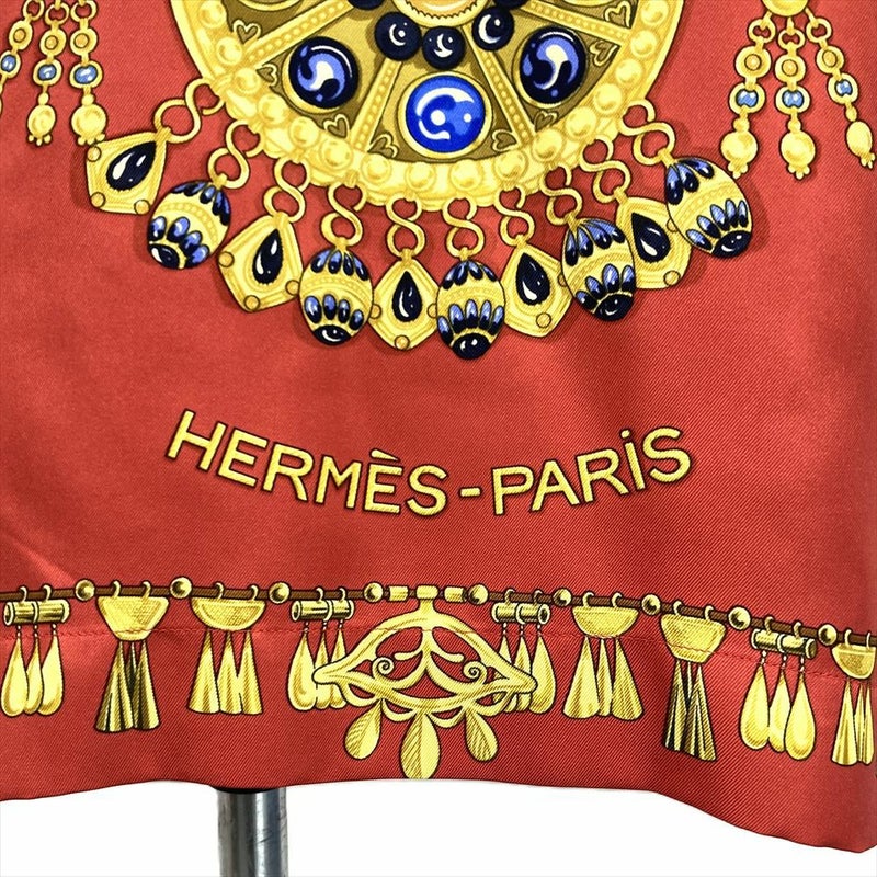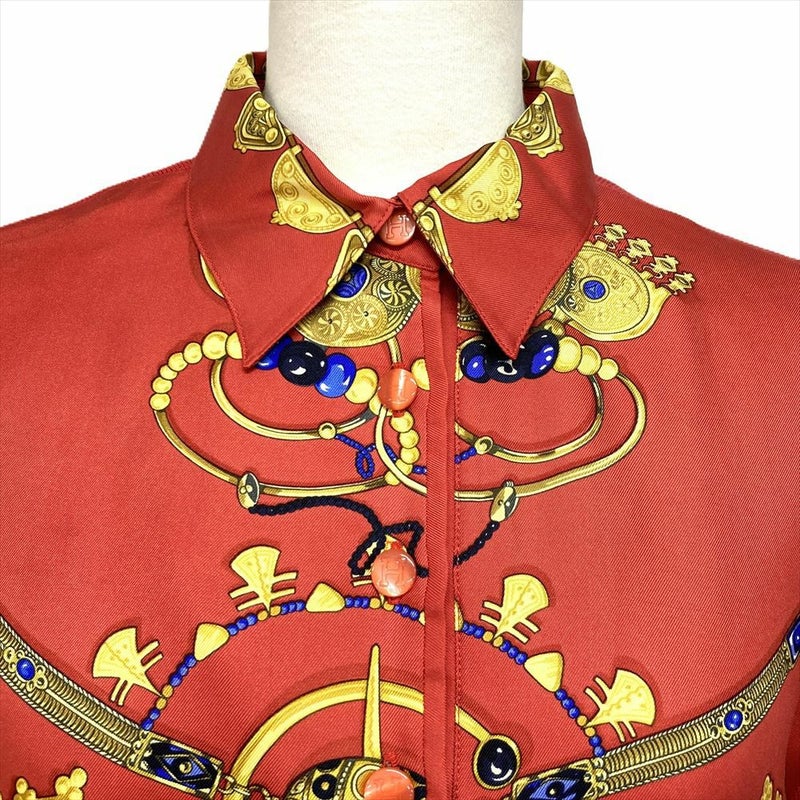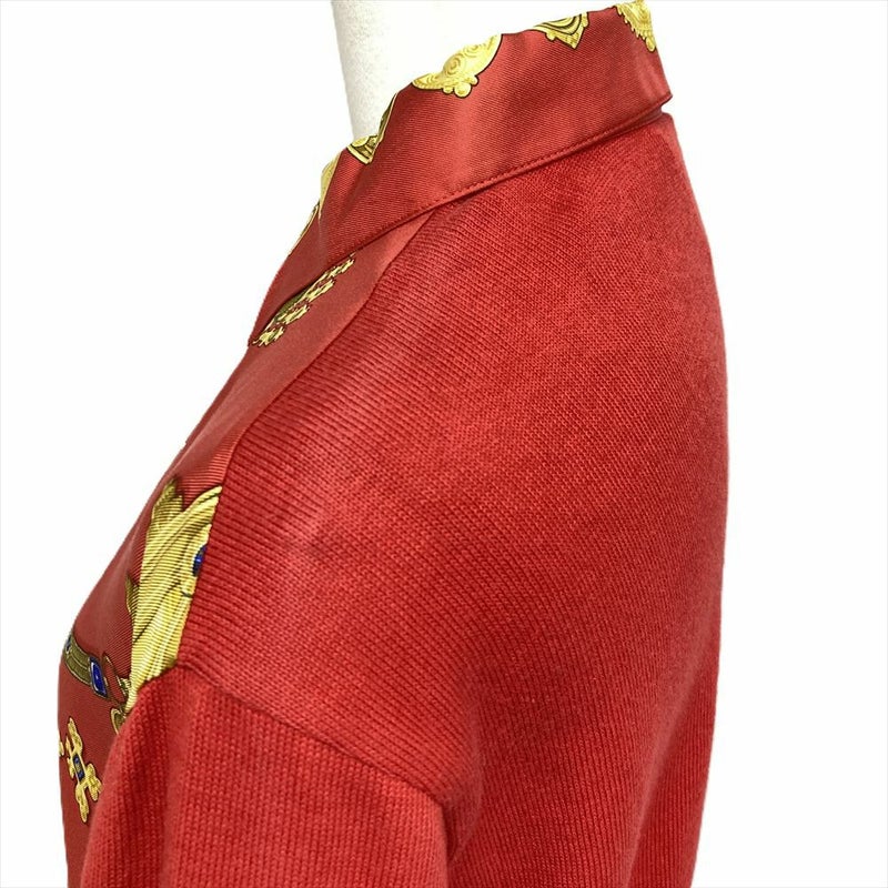 4. エルメス HERMES ニット切替 シルクブラウス ブラウス シルク レッド M スカーフ柄 半袖シャツ レディース【中古】