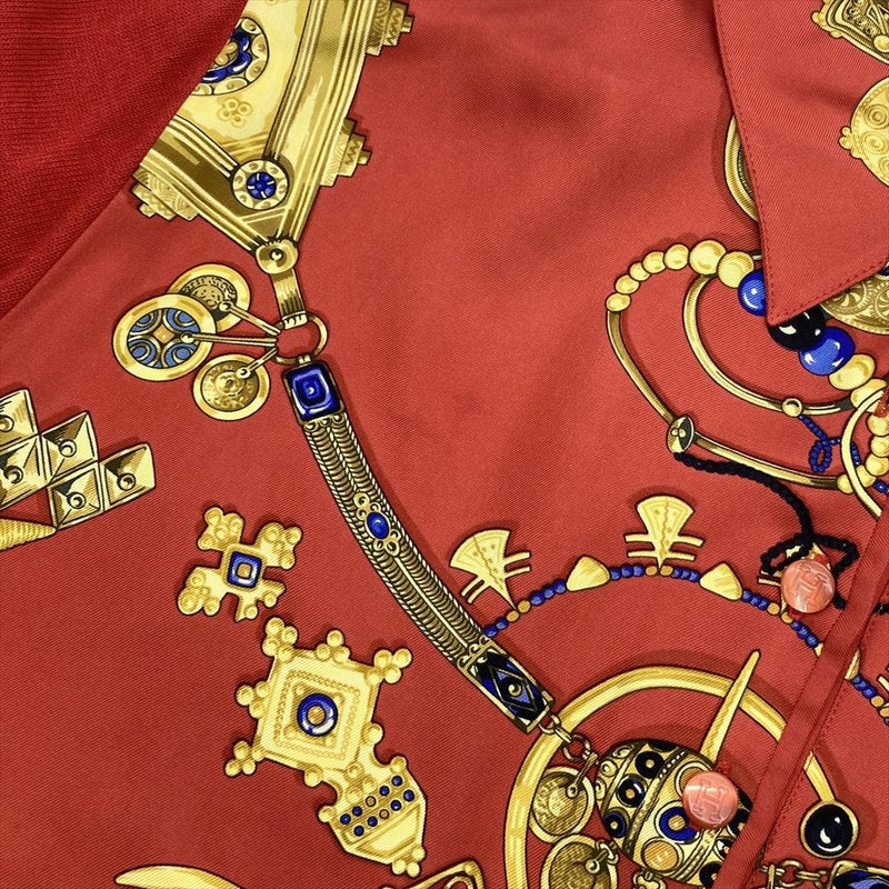 5. エルメス HERMES ニット切替 シルクブラウス ブラウス シルク レッド M スカーフ柄 半袖シャツ レディース【中古】