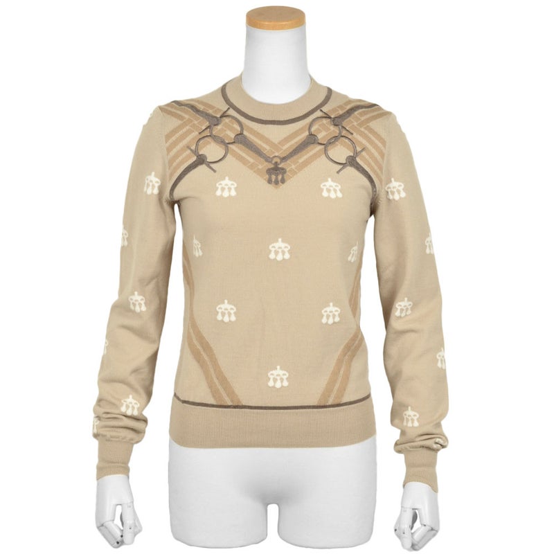 4. エルメス HERMES 馬銜 セーター ウール ベージュ 34 ロングスリーブ 刺繍 レディース【中古】