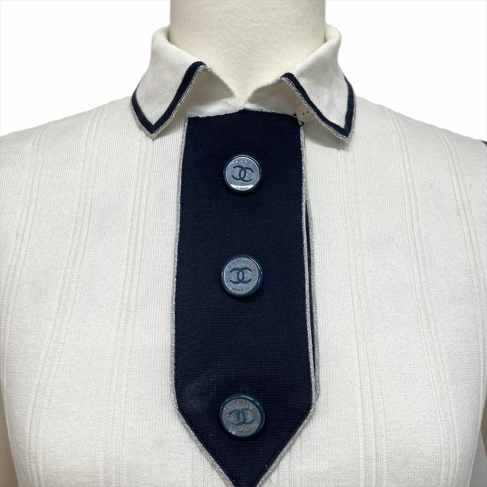 3. シャネル CHANEL ノースリーブ ポロ ニット コットン レーヨン ポリエステル P32408K00714 ホワイト 38 ココボタン 08C レディース【中古】