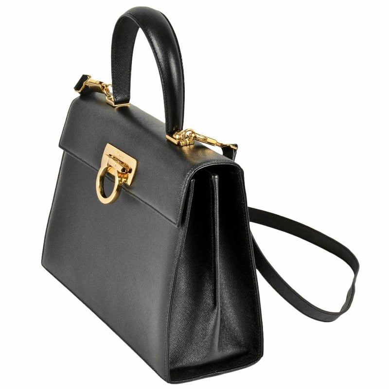 5. フェラガモ Ferragamo ガンチーニ ハンドバッグ 2WAY レザー 21 2181 ブラック ショルダーバッグ【中古】