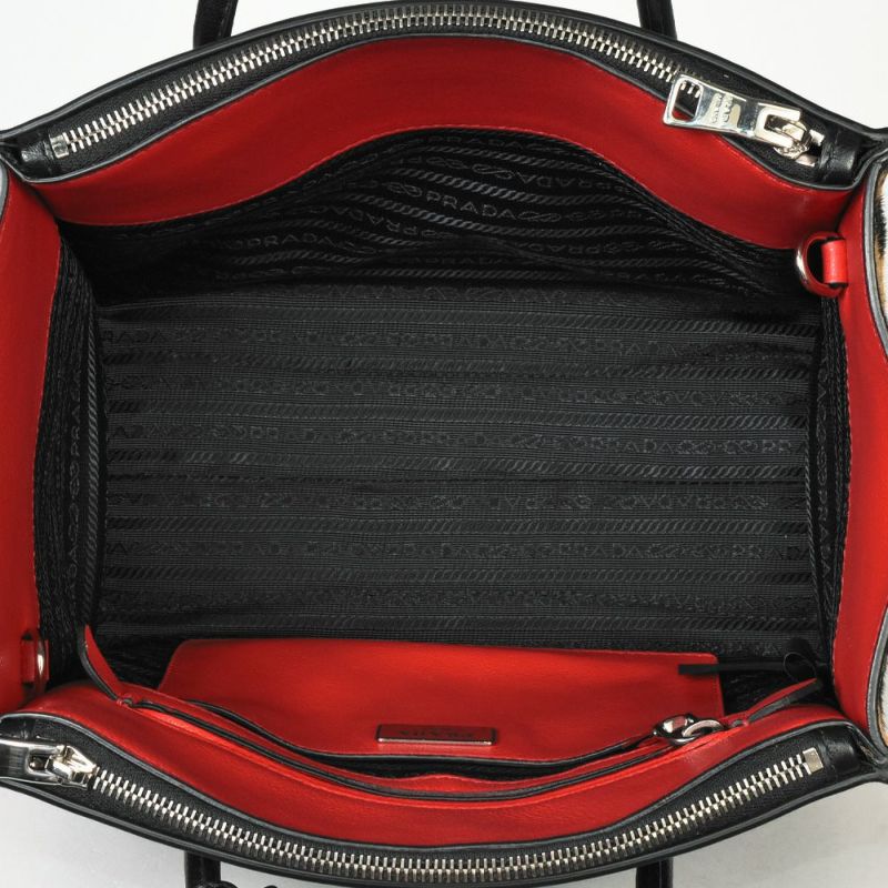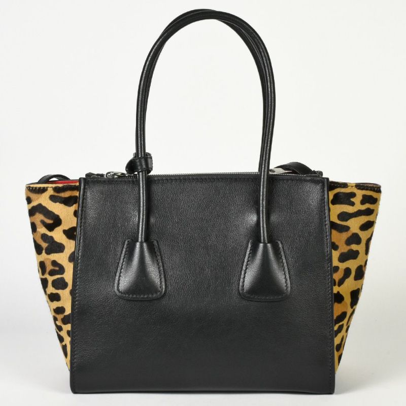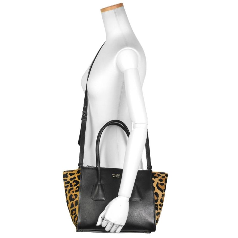 5. プラダ PRADA レオパード トートバッグ 2WAY レザー ハラコ 1BG625 ブラック ショルダーストラップ付 ハンドバッグ【中古】