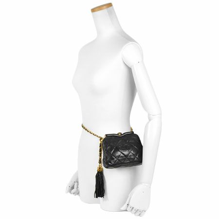 5. シャネル CHANEL マトラッセ ココマーク チェーンストラップ付 ハンドバッグ タッセル がま口 ウェストポーチ ブラック ラムスキン ゴールド金具【中古】