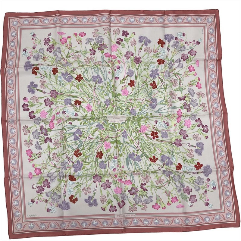 エルメス HERMES カレ90 OEillets sauvages et autres Caryophyllees 野生のカーネーションやナデシコ スカーフ シルク ピンク レディース【中古】