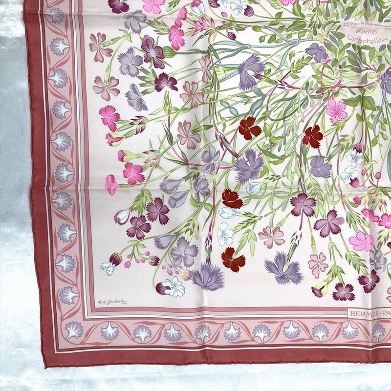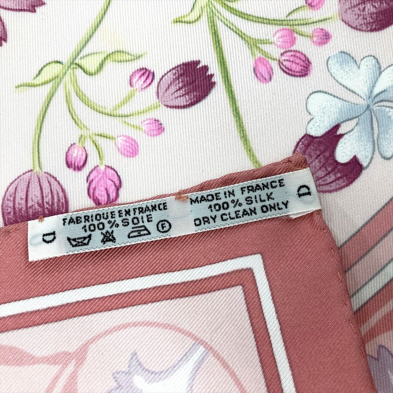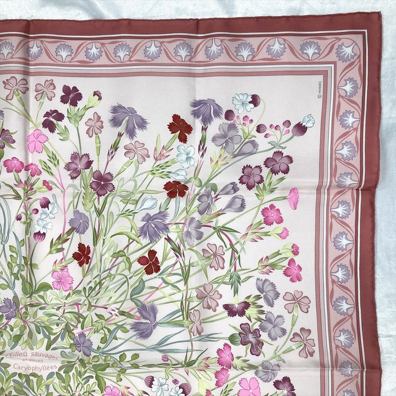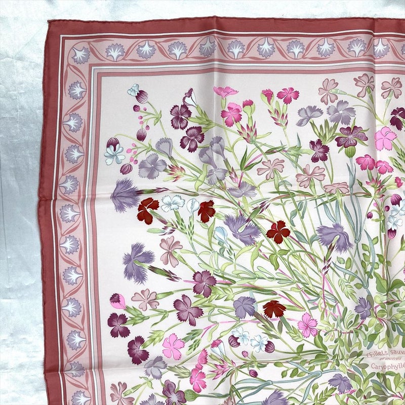 5. エルメス HERMES カレ90 OEillets sauvages et autres Caryophyllees 野生のカーネーションやナデシコ スカーフ シルク ピンク レディース【中古】
