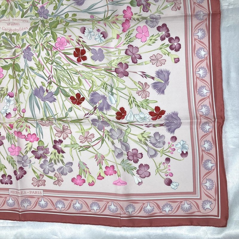 3. エルメス HERMES カレ90 OEillets sauvages et autres Caryophyllees 野生のカーネーションやナデシコ スカーフ シルク ピンク レディース【中古】