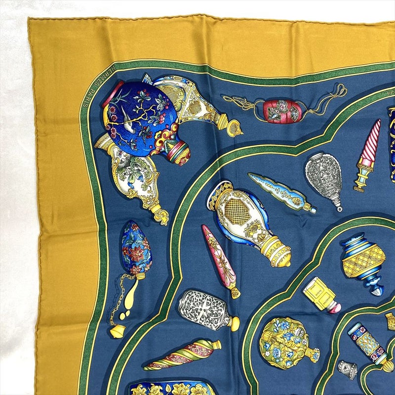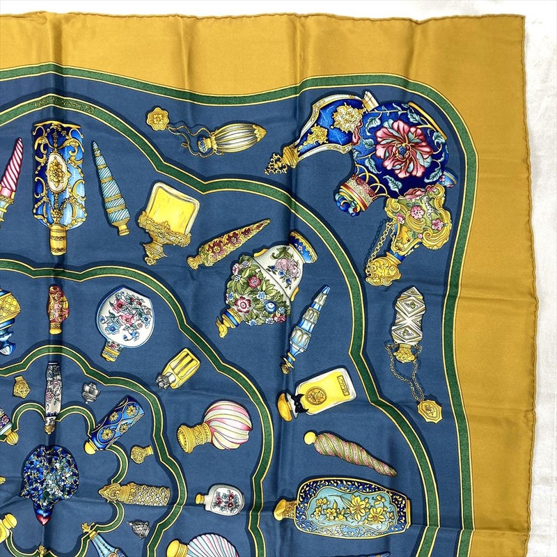 3. エルメス HERMES カレ90 Pourvu qu'on ait l'ivresse 香水瓶 スカーフ シルク ブルー イエロー レディース【中古】