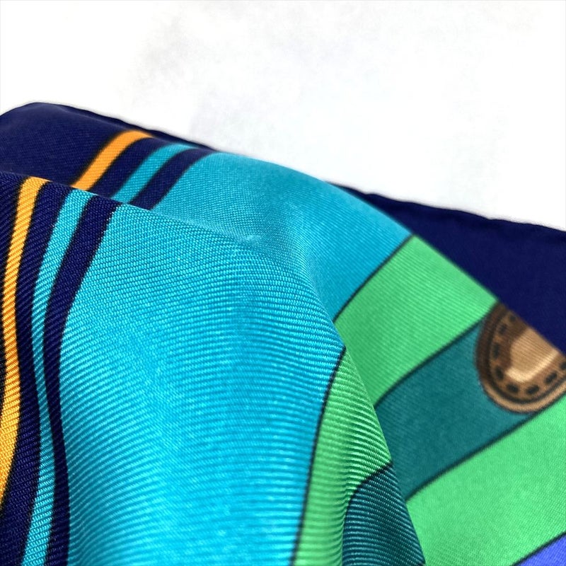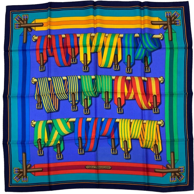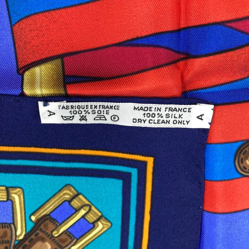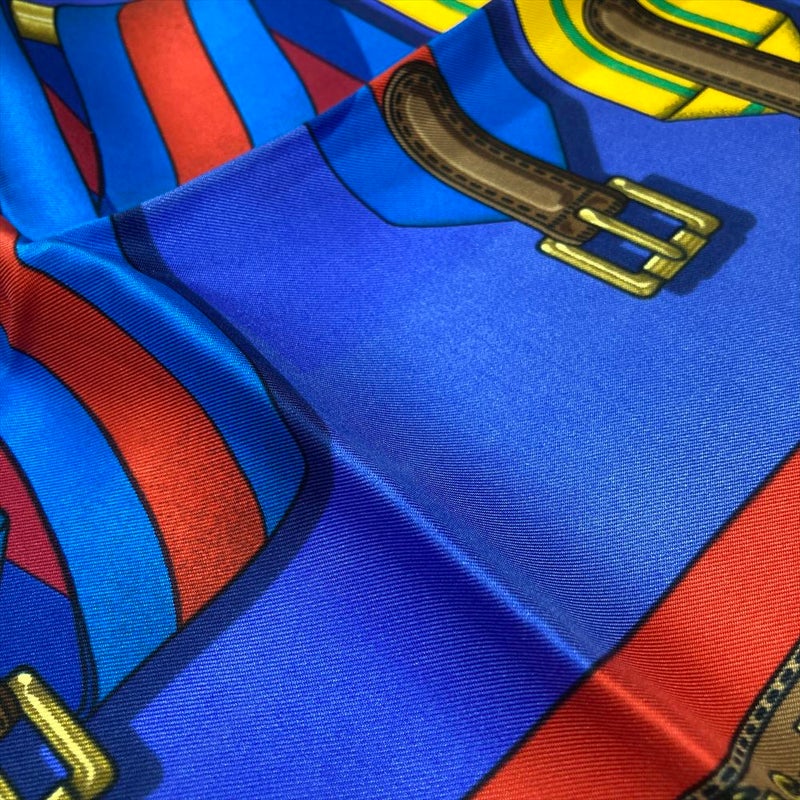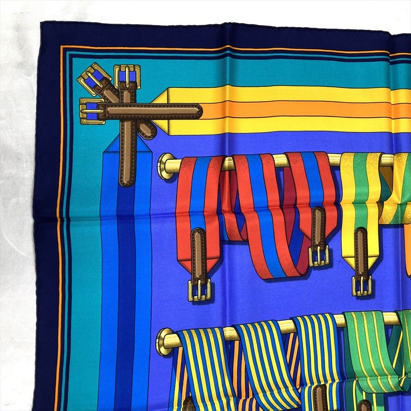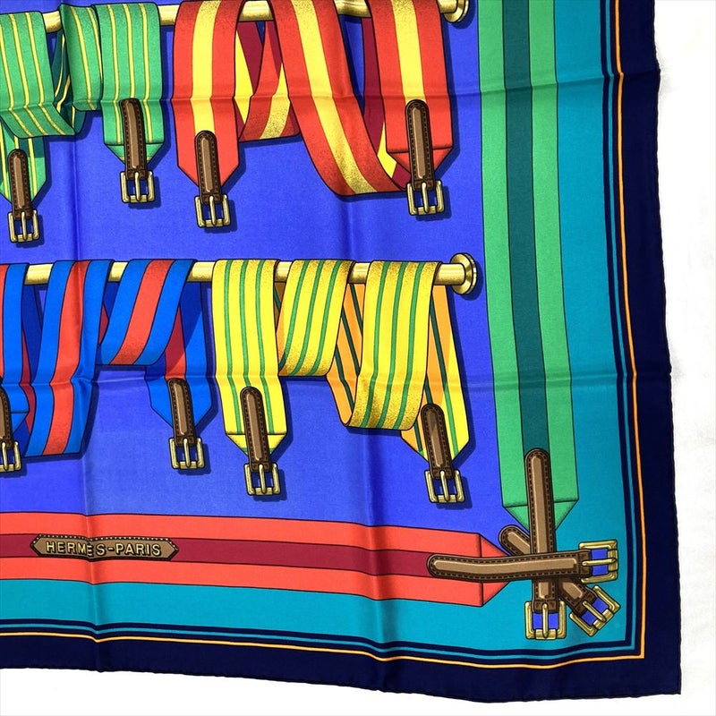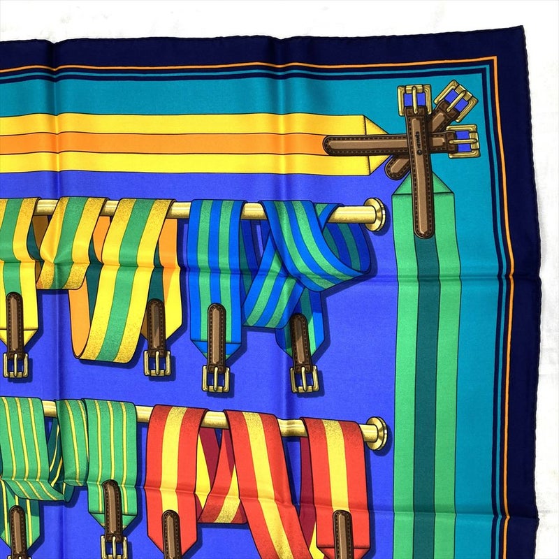 3. エルメス HERMES カレ90 J.METZ Les Sangles サスペンダーベルト スカーフ シルク ブルー レディース【中古】