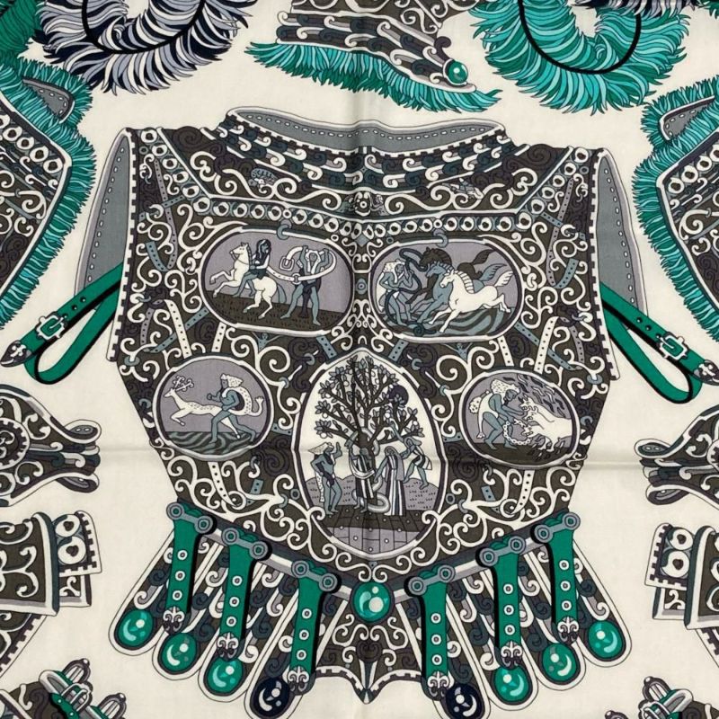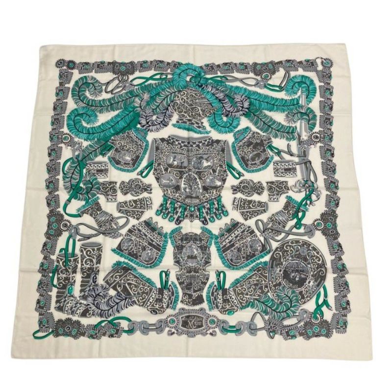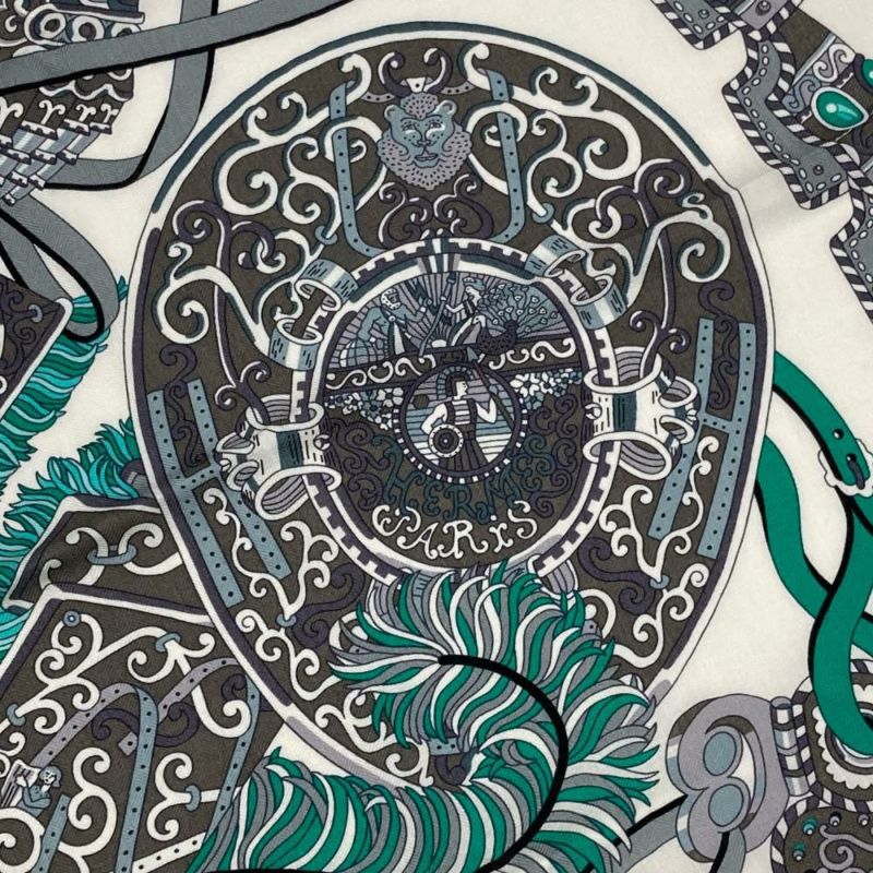 3. エルメス HERMES カレ140 カレジェアン SOUS LEGIDE DE MARS 軍神マルス スカーフ カシミヤ シルク グリーン【中古】