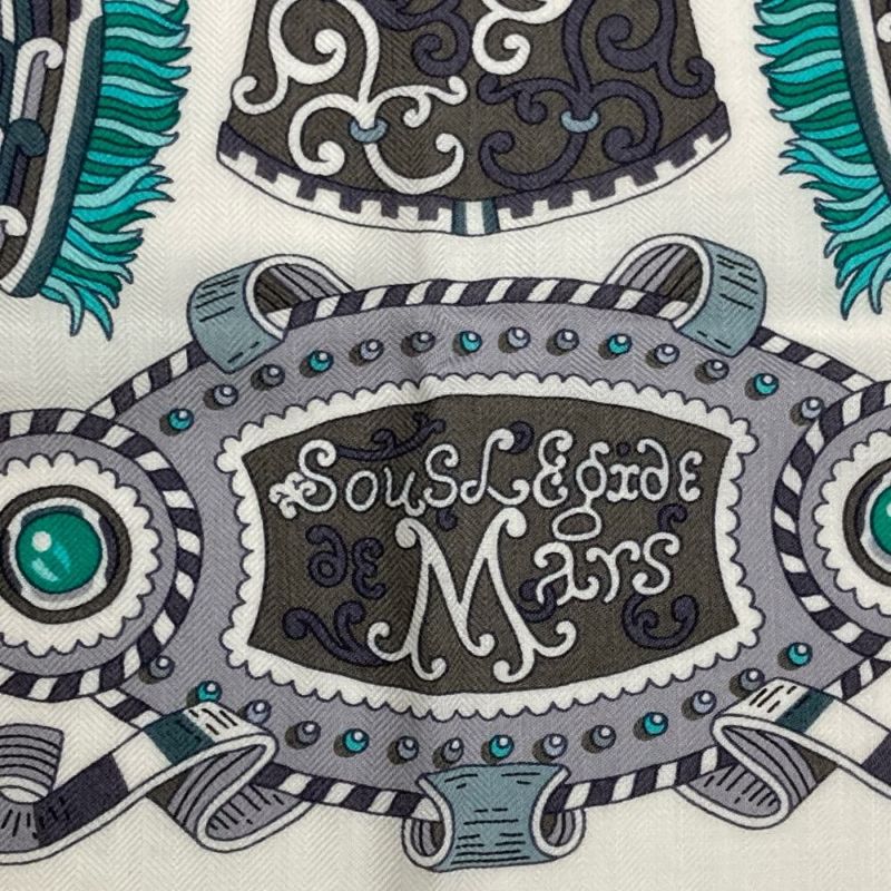 5. エルメス HERMES カレ140 カレジェアン SOUS LEGIDE DE MARS 軍神マルス スカーフ カシミヤ シルク グリーン【中古】