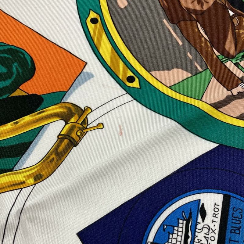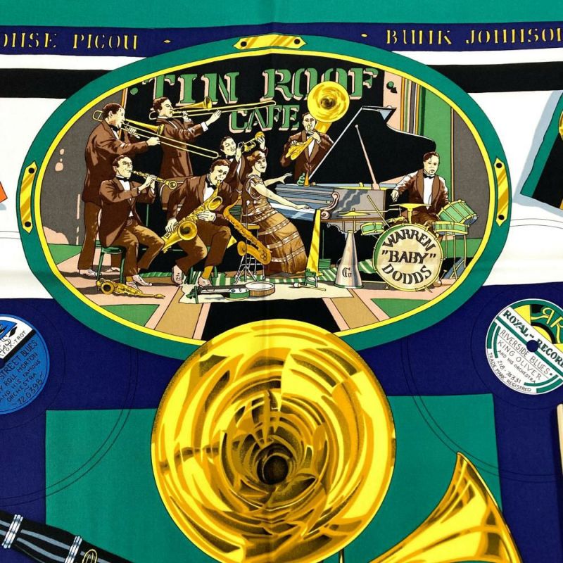 3. エルメス HERMES カレ90 ニューオリンズ クレオール ジャズ THE ORIGINAL NEW ORLEANS CREOLE JAZZ スカーフ シルク グリーン【中古】