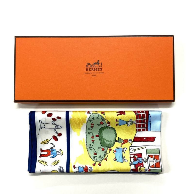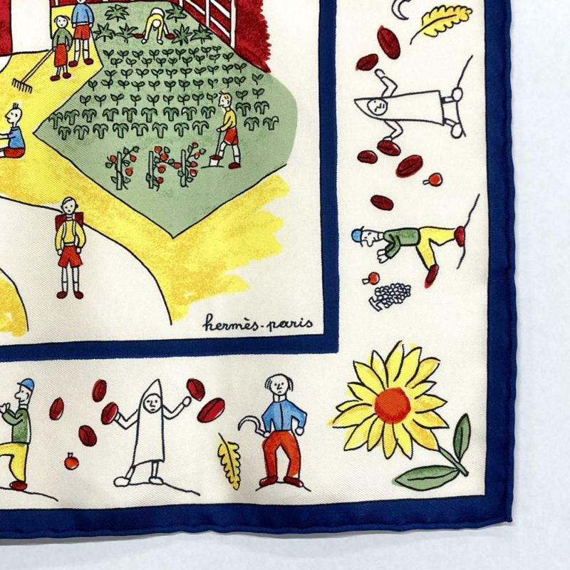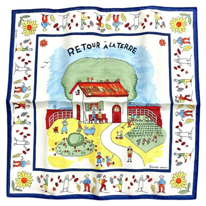 3. エルメス HERMES プチカレ カレ40 RE TOUR A LA TERRE 故郷に帰る スカーフ シルク ブルー【中古】