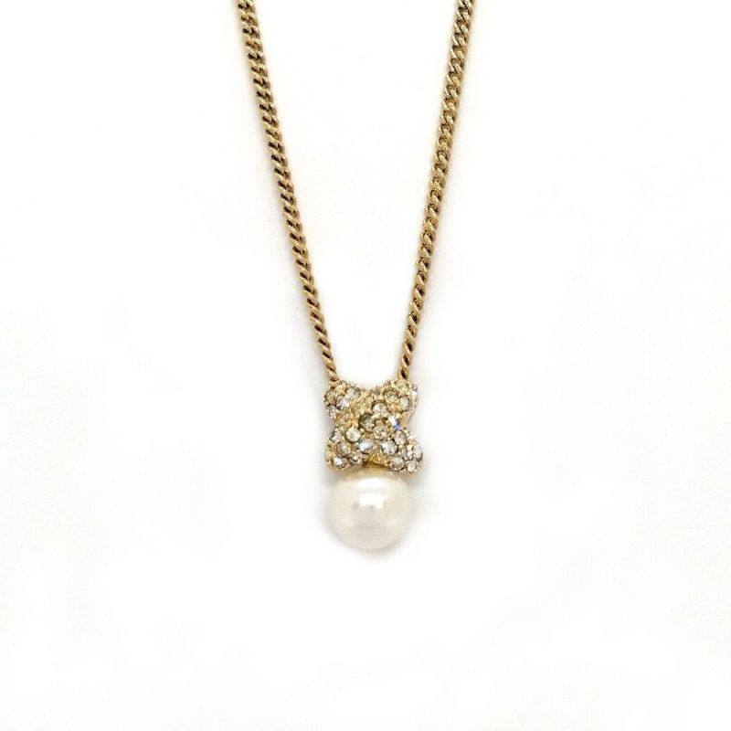 クリスチャンディオール Christian Dior 1P フェイクパール ネックレス ゴールド ラインストーン クロス 真珠 GP【中古】