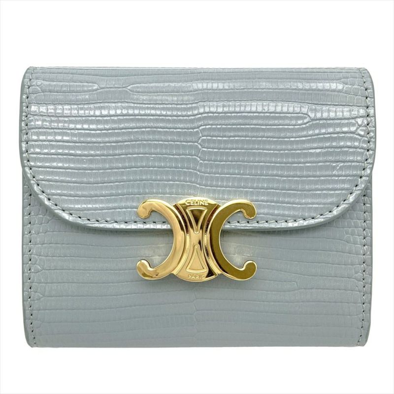 美品 セリーヌ CELINE トリオンフ スモール フラップウォレット 三つ折り財布 リザード ブルー アイスブルー【中古】