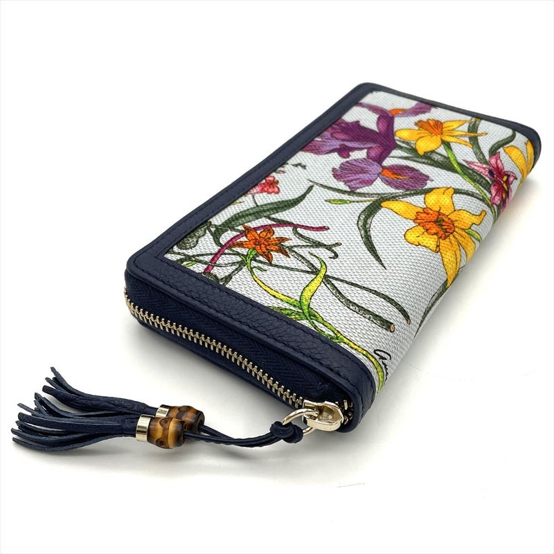 4. グッチ GUCCI 日本50周年記念 フローラ 長財布 シマレザー キャンバス ネイビー ゴールド金具 バンブータッセル レディース【中古】