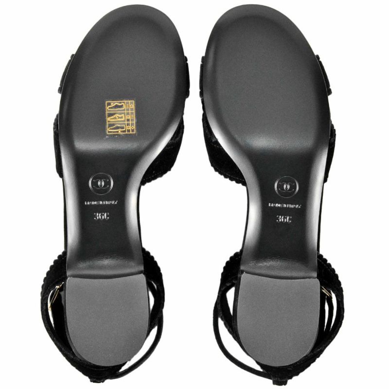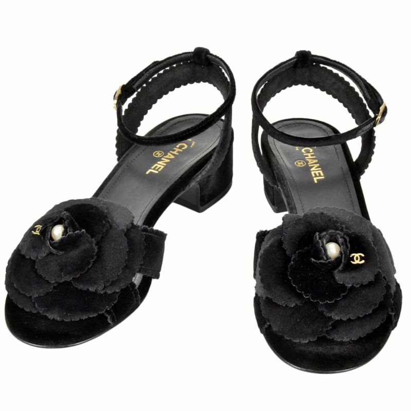 シャネル CHANEL カメリア ポインテッドトゥ サンダル ベルベット ブラック 36Cサイズ 約23cm ほぼ未使用 レディース【中古】
