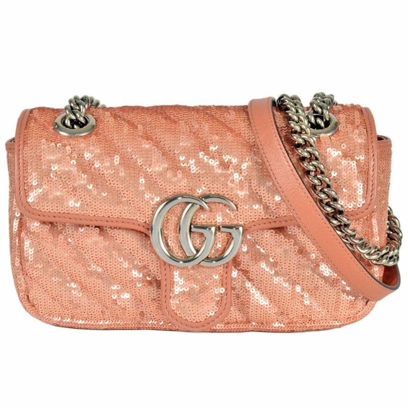 3. グッチ GUCCI GGマーモント スモール ショルダーバッグ スパンコール レザー ピンク シルバー金具 チェーン【中古】
