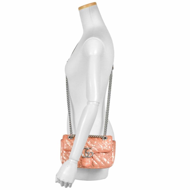 4. グッチ GUCCI GGマーモント スモール ショルダーバッグ スパンコール レザー ピンク シルバー金具 チェーン【中古】