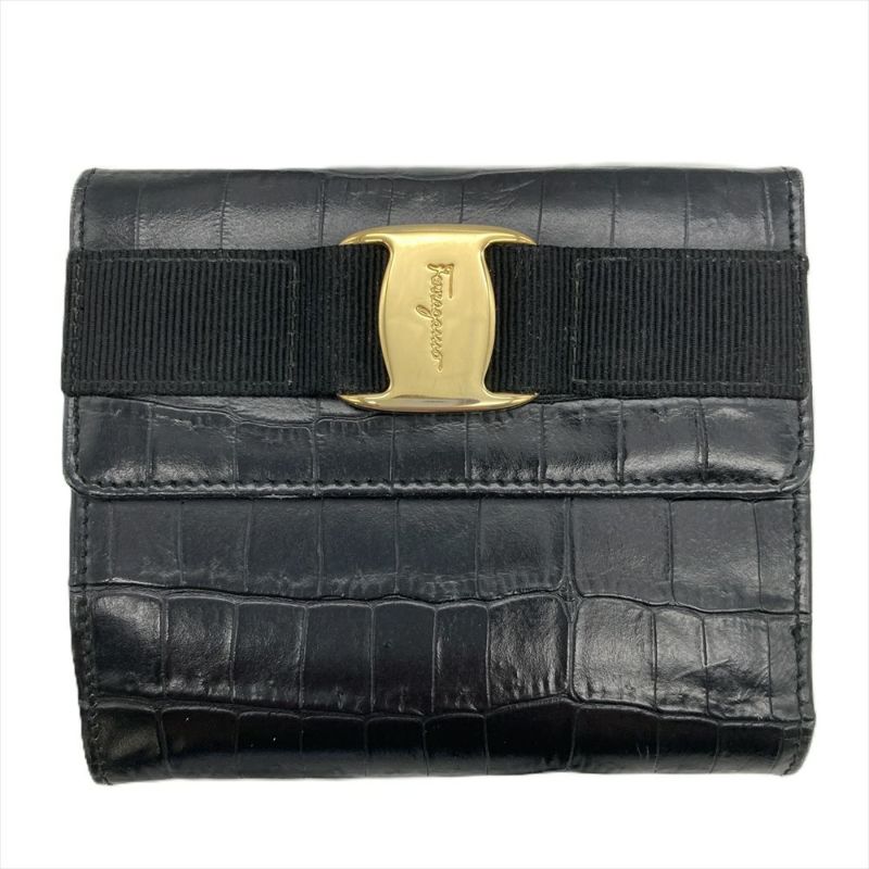 フェラガモ Ferragamo ヴァラ 二つ折り財布 レザー 224068 ブラック ゴールド金具 クロコ型押し レディース【中古】