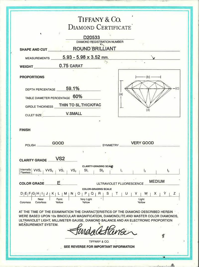 - ティファニー Tiffany&Co. ソリティア リング 指輪 ダイヤモンド 0.75ct 約8.5号 Pt950 4.4g プラチナ E/VS2 レディース【中古】