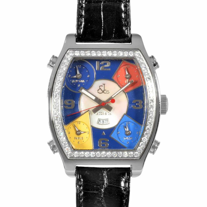 ジェイコブ JACOB&Co. 5タイムゾーン ダイヤベゼル 腕時計 ブルー シェル文字盤 トノー メンズ【中古】