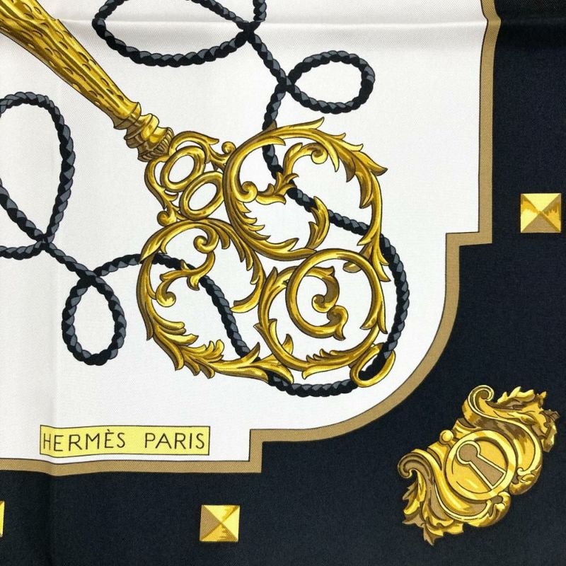 3. エルメス HERMES カレ90 LES CLES 鍵 モチーフ スカーフ シルク ブラック【中古】