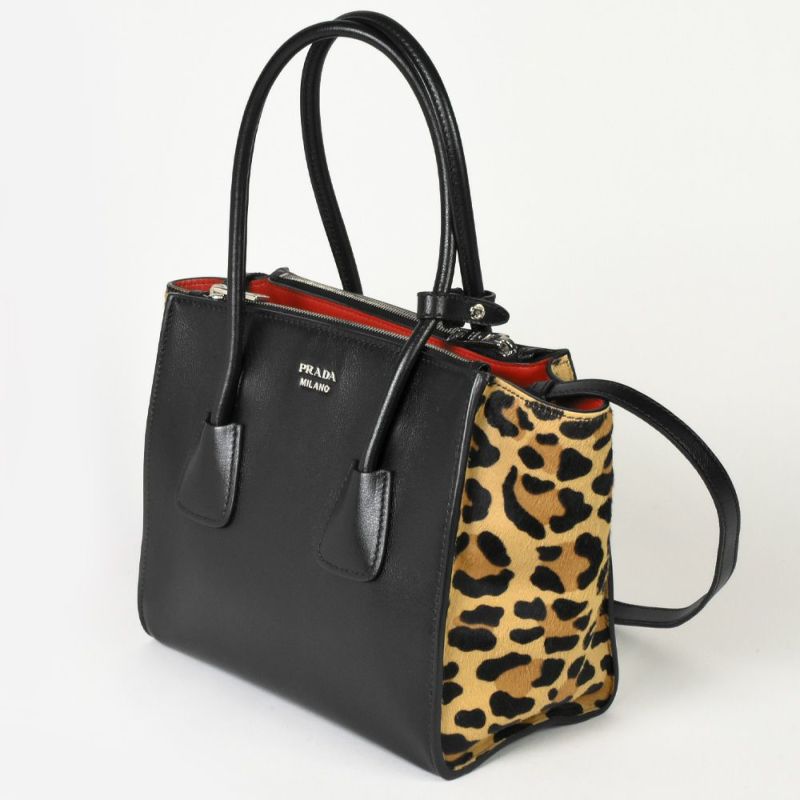 3. プラダ PRADA レオパード トートバッグ 2WAY レザー ハラコ 1BG625 ブラック ショルダーストラップ付 ハンドバッグ【中古】