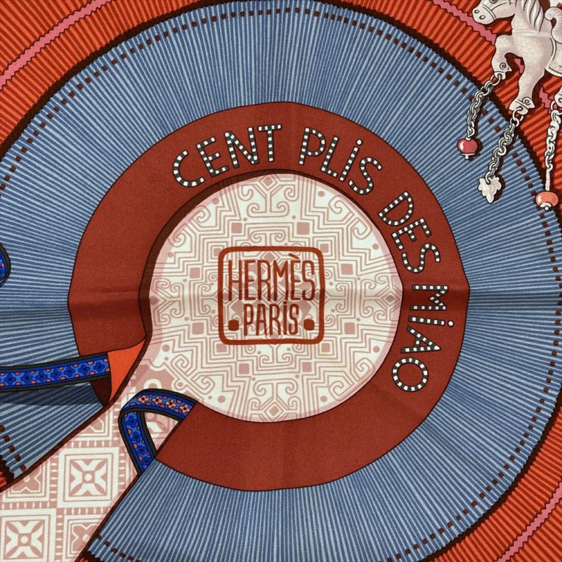 3. エルメス HERMES カレ90 芽家のプリーツ CENT PLIS DES MIAO スカーフ シルク レッド【中古】