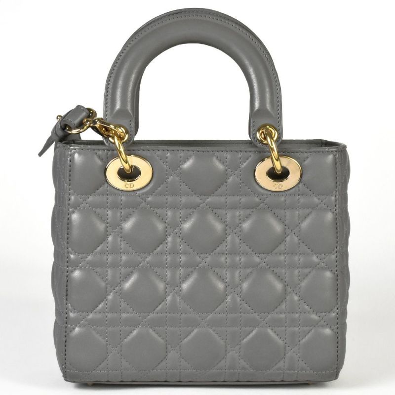 3. ディオール Dior レディディオール スモール カナージュ ハンドバッグ 2WAY ラムスキン グレー ゴールド金具 ショルダーストラップ付【中古】