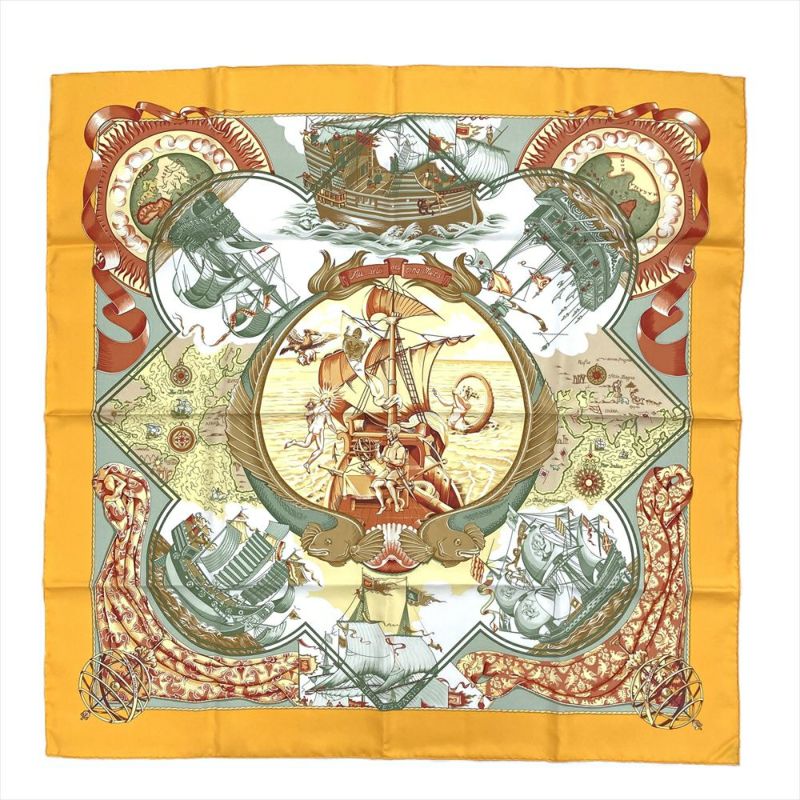 3. エルメス HERMES カレ90 5つの海を越えて AU DELA DES CINQ MERS スカーフ シルク イエロー レディース【中古】