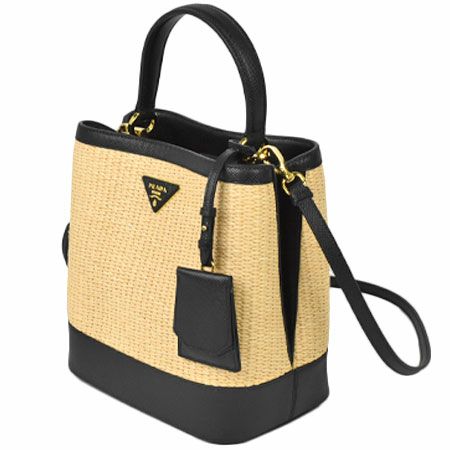 送料無料 プラダ PRADA パニエ ミディアム ショルダーストラップ付 2WAY ハンドバッグ サフィアーノ レザー ストロー ブラック 1BA212【中古】