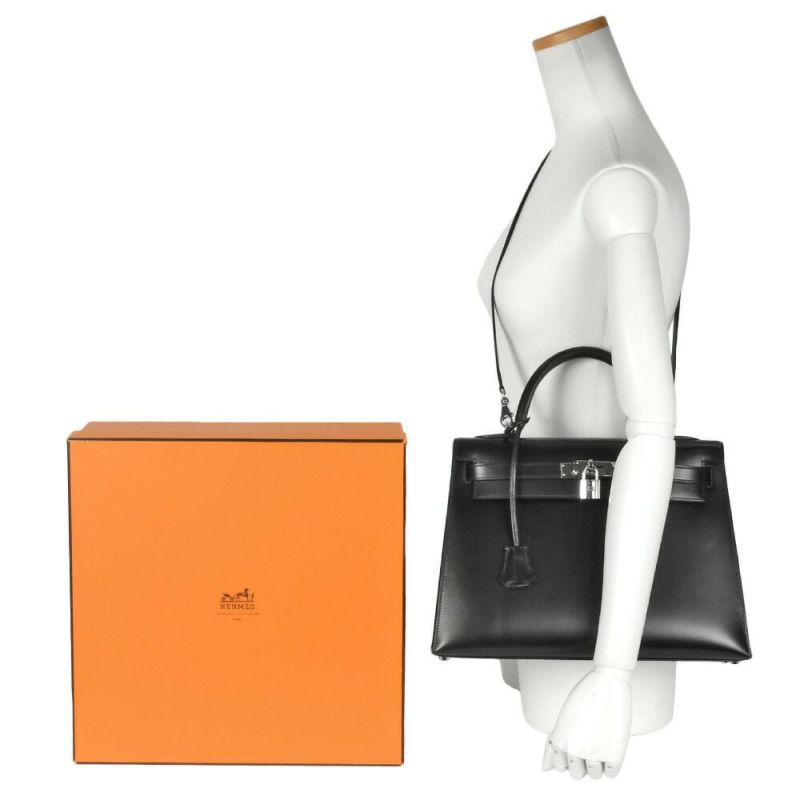 4. エルメス HERMES ケリー32 外縫い ショルダーストラップ付 2WAY ハンドバッグ ボックスカーフ ノワール シルバー金具 □J刻印(2006年)【中古】
