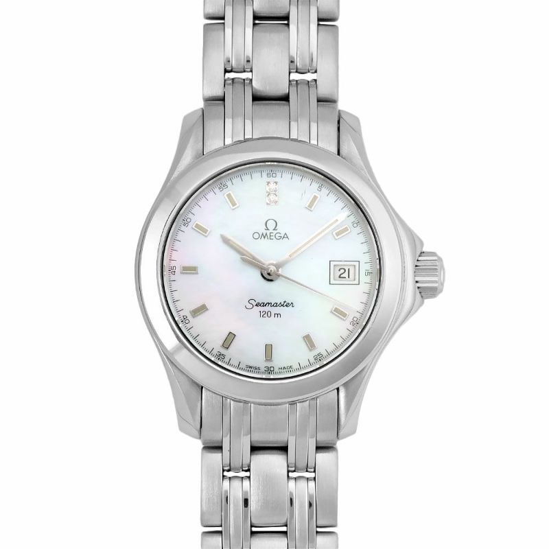 送料無料 6か月動作保証付 電池交換済 仕上済 オメガ OMEGA シーマスター デイト 120M SS 2P ダイヤモンド レディース クォーツ 時計 ホワイトシェル文字盤 2581.64【中古】