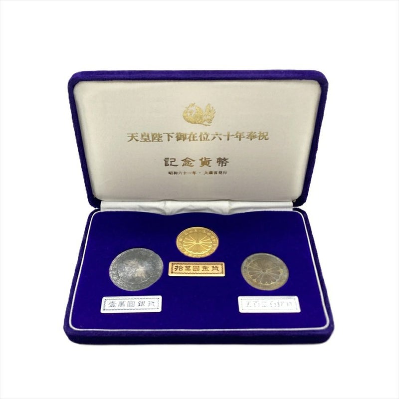 商品名 天皇御在位 六十年記念 10万円金貨幣 1万円銀貨幣 500円白銅貨幣 貨幣3点セット