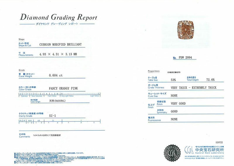 4. ルース ダイヤモンド 0.604ct クッションカット ファンシーオレンジピンク SI1 裸石【中古】