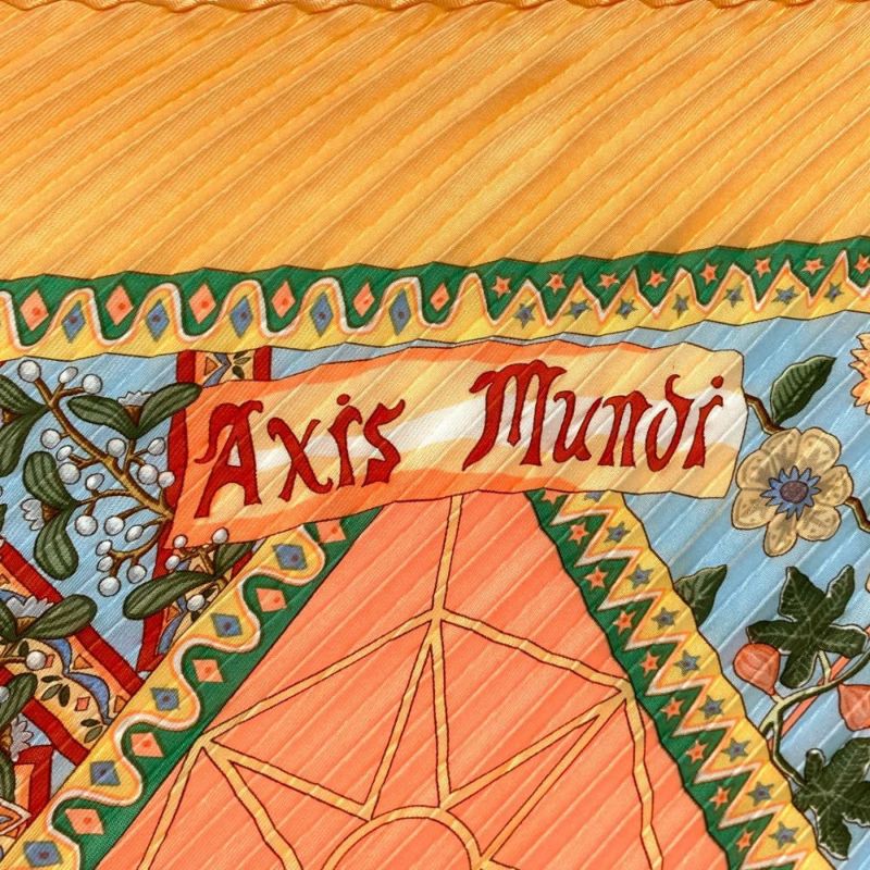 5. エルメス HERMES カレ90 プリーツ 世界の中心軸 Axis Mundi スカーフ シルク オレンジ【中古】