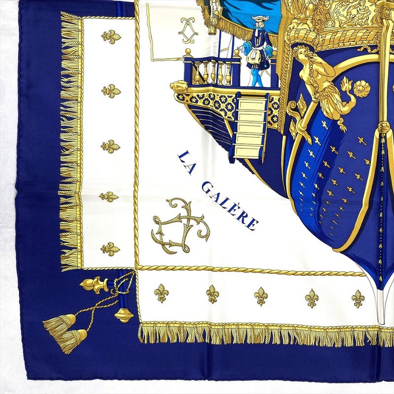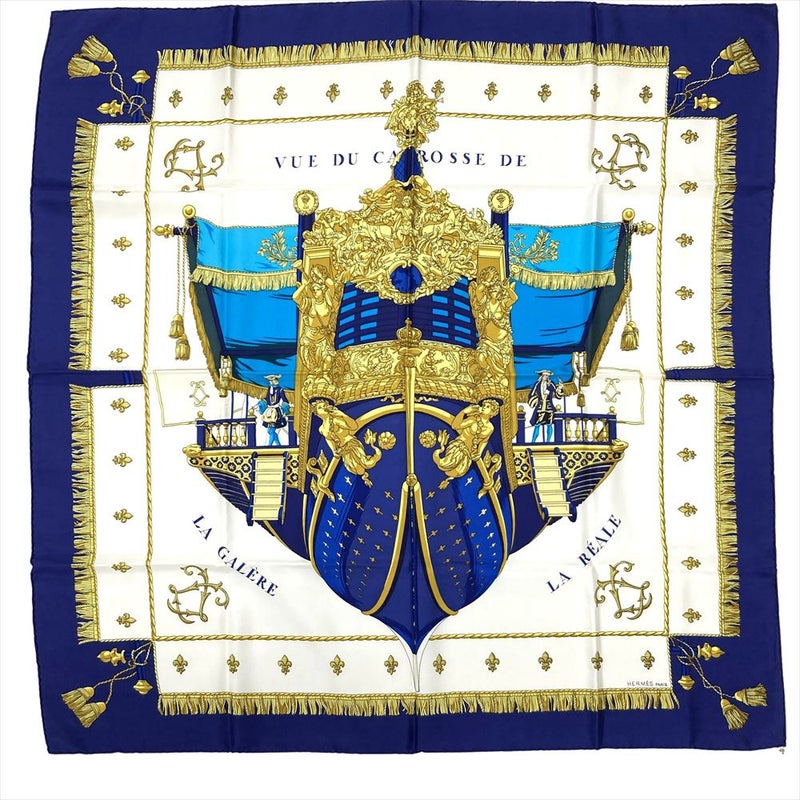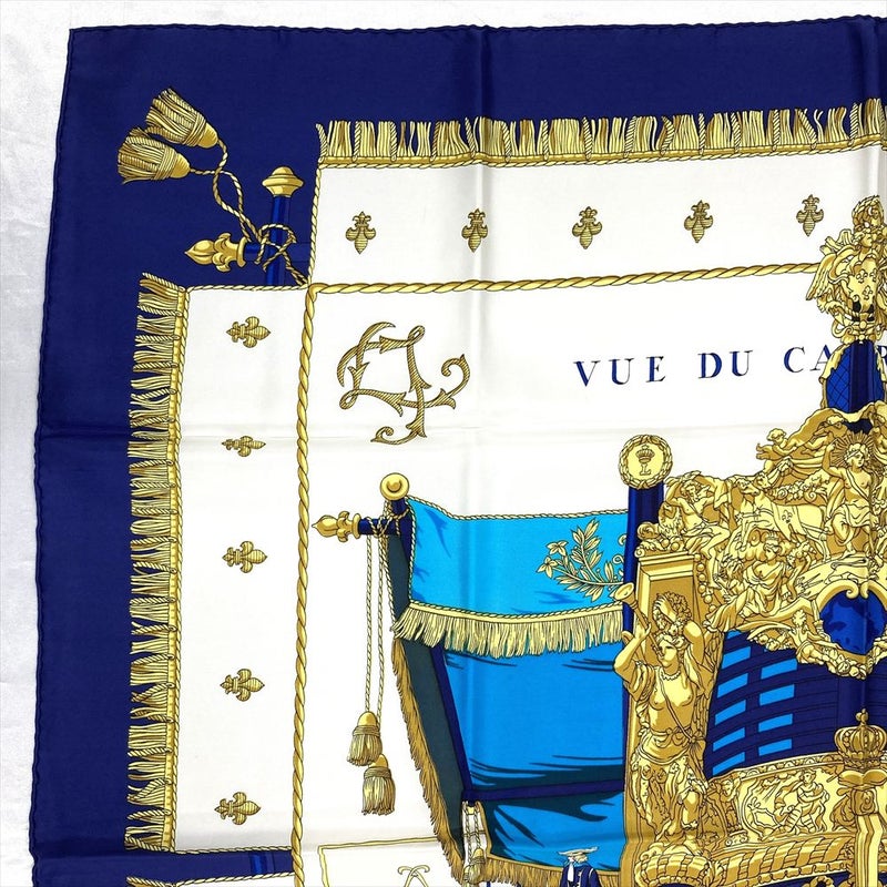3. エルメス HERMES カレ90 VUE DU CARROSSE DE LA GALERE LA REALE クィーンの戴冠式 スカーフ シルク ブルー レディース【中古】
