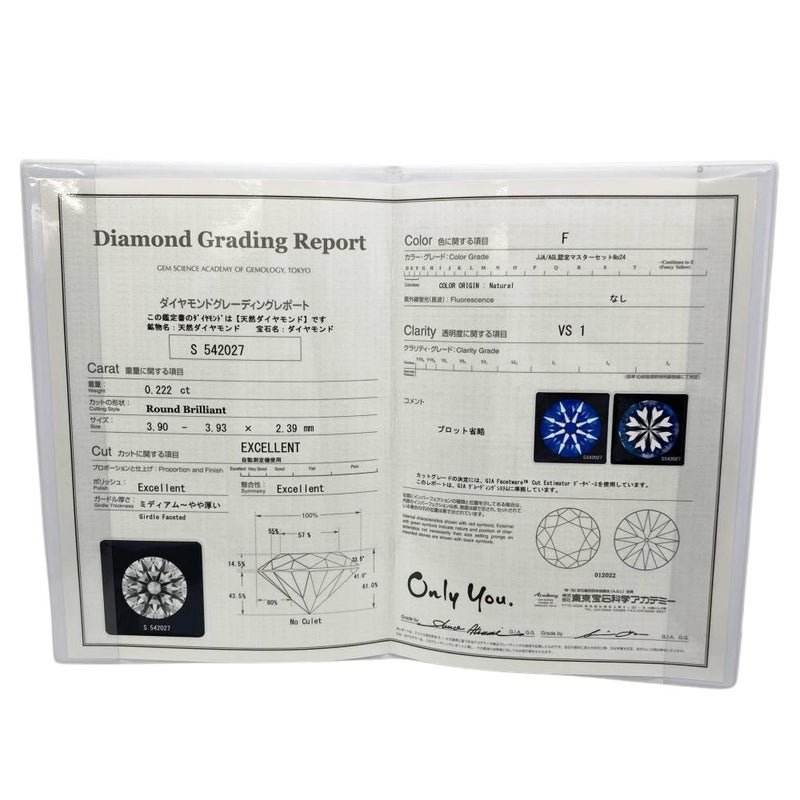 3. オンリーユー Only You ソリティア リング 指輪 ダイヤモンド 0.222ct 約8号 Pt950 2.9g アクアマリン プラチナ F/VS1/3EX レディース【中古】