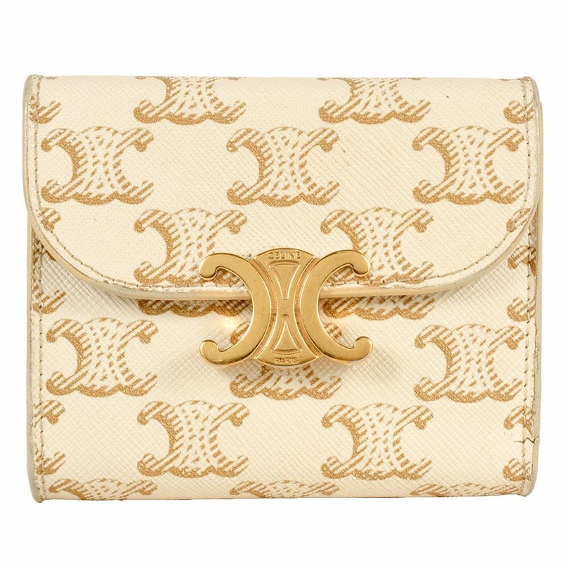 3. セリーヌ CELINE トリオンフ スモールフラップウォレット 三つ折り財布 PVCコーティングキャンバス レザー アイボリー ブラウン ゴールド金具 レディース【中古】